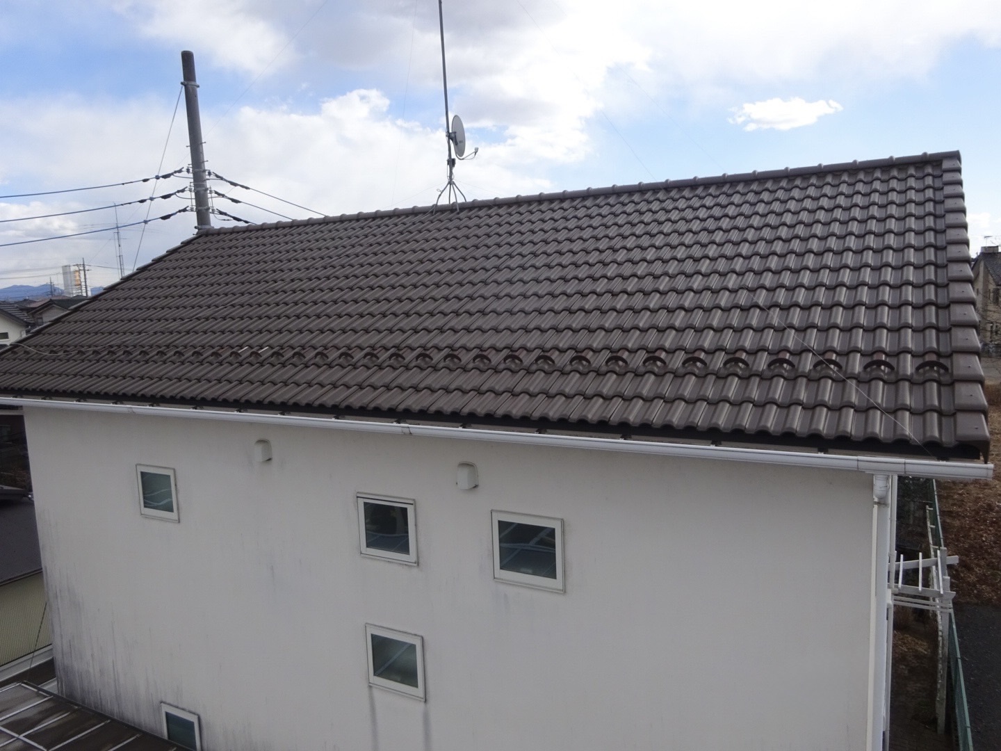 塗装前は汚れが目立つ状態でしたが、塗装したことできれいになり、屋根や玄関ドアの色とも相性がよい、南ヨーロッパ風の雰囲気に仕上がりました。